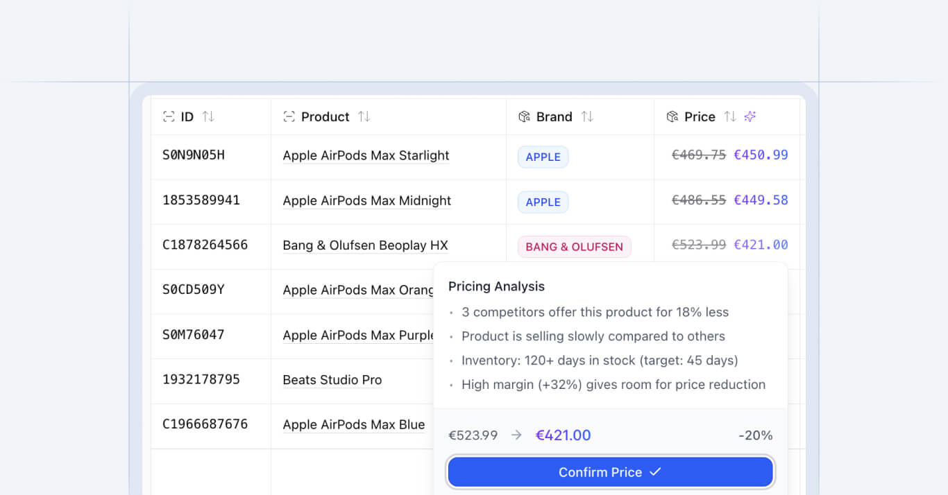 Retail data is messy. Duplicates, missing values and inconsistent product names are the norm. This AI agent uses multi-modal models, combining text, image and numerical data, to detect and fix structural issues in product data. It flags critical gaps and fills missing relationships. If a field is irrelevant to margin or pricing logic, it is deprioritized. This keeps data cleaning efficient and relevant.
